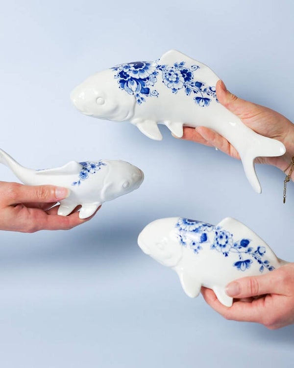 Een sierlijke porseleinwitte koi karper van keramiek om aan de muur te hangen. Deze sierlijke vissen uit Japan of China, zijn een echt statussymbool en worden gehouden om mee te pronken. Afhankelijk van hun kleuren en patronen kunnen deze vissen een vermogen kosten. Tegelijkertijd staat deze vis symbool voor moed en kracht, omdat het sterke vissen zijn die zelfs stroomopwaarts kunnen zwemmen. Onze keramieken vissen kunnen zelfs tegen je muur opzwemmen en met hun zeldzame Delfts blauwe kleuren zijn ze bijzonder zeldzaam en geliefd.